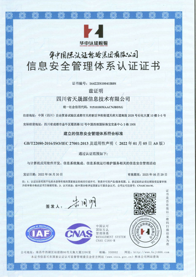 2022年6月30日,四川省天晟源信息技術(shù)有限公司(簡(jiǎn)稱“信息子公司”)順利通過(guò)了信息安全管理體系認(rèn)證的專項(xiàng)審核,正式獲得質(zhì)量管理體系(GB/T19001-2016/ISO 9001:2015)、環(huán)境管理體系(GB/T24001-2016/ISO 14001:2015)、職業(yè)健康安全管理體系(GB/T45001-2020/ISO 45001:2018)和信息安全管理體系(GB/T22080-2016/ISO/IEC?27001:2013)四項(xiàng)認(rèn)證證書,這標(biāo)志信息子公司在信息系統(tǒng)集成、信息系統(tǒng)運(yùn)行維護(hù)和計(jì)算機(jī)應(yīng)用軟件開發(fā)方面的規(guī)范化、標(biāo)準(zhǔn)化和信息安全管理水平達(dá)到新的高度。