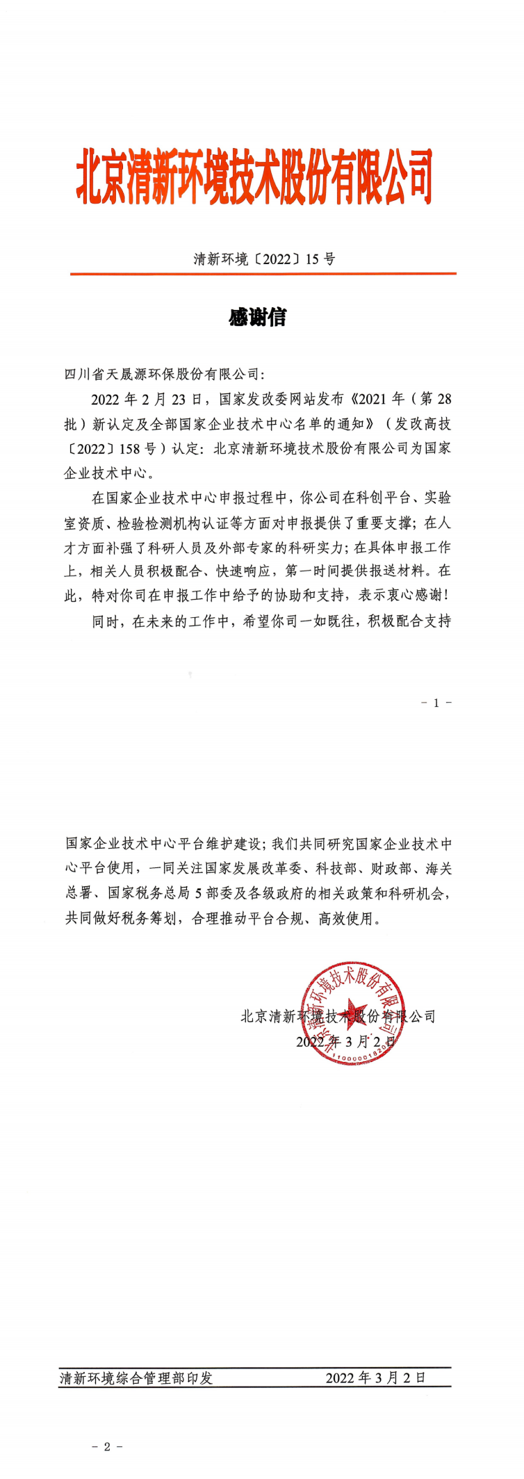在清新環(huán)境技術(shù)中心申報認(rèn)定過程中,天晟源環(huán)保在科創(chuàng)平臺、實驗室資質(zhì)、檢驗檢測機(jī)構(gòu)認(rèn)證等方面對申報提供了重要支撐;在人才方面補強了科研人員及外部專家的科研實力;在具體申報工作上,相關(guān)人員積極配合、快速響應(yīng),第一時間提供報送材料。3月2日,清新環(huán)境特發(fā)來感謝信,向天晟源環(huán)保在申報工作中給予的協(xié)助和支持表示感謝。
